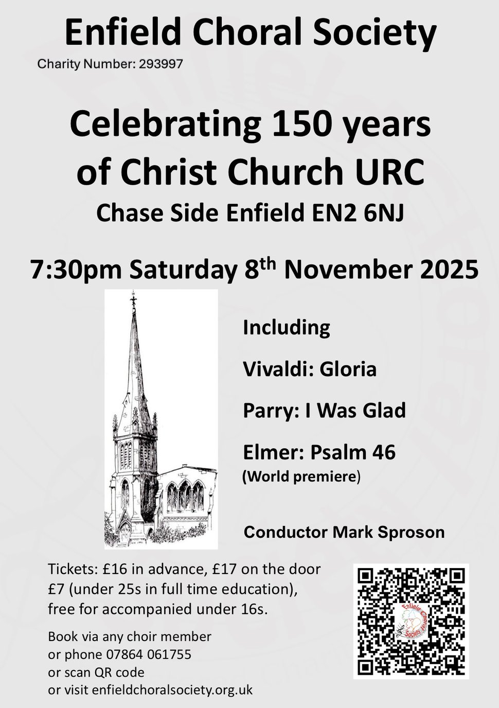 Enfield Choral Society’s next concert on Saturday 8th November 2025 at Christ Church URC Enfield is special in several ways.