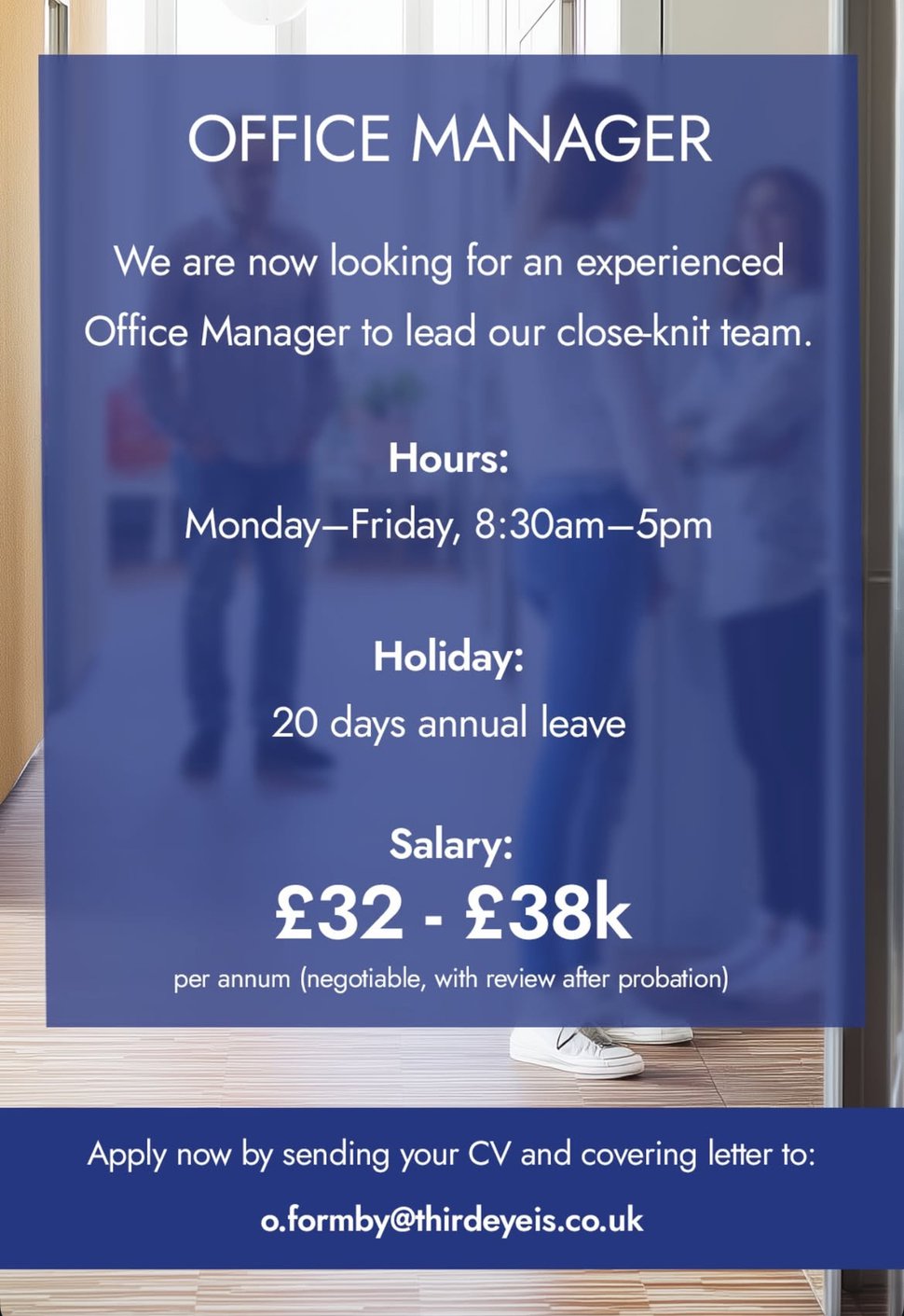 We are now looking for an experienced Office Manager to lead our close-knit team. Salary: £32,000-£38,000 per annum (negotiable, with review after probation) Hours: Monday–Friday, 8:30am–5pm Holiday: 20 days annual leave 📧 Apply now by sending your CV and covering letter to [email protected]
